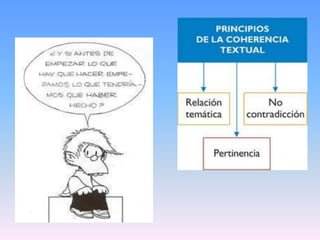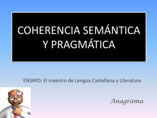 El documento habla sobre la coherencia semántica y pragmática en un ensayo sobre el maestro de lengua castellana y literatura. 1) La coherencia semántica se refiere al significado global del texto y cómo se construye a través de operaciones como adjunción, especificación, combinación y generalización. 2) La coherencia pragmática depende de las estrategias del lector para interpretar el texto basadas en aspectos intrínsecos del texto y funciones del maestro. 3) El documento concluye que es importante asociar la