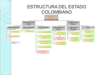 Este documento describe las funciones del Estado y los órganos del poder público en Colombia. Explica que el Estado colombiano se divide en tres ramas: ejecutiva, legislativa y judicial. Detalla los organismos que componen cada rama como la Presidencia, el Congreso, la Corte Constitucional y sus funciones principales como hacer cumplir las leyes, elaborar normas y aplicar la justicia respectivamente.