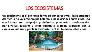 Este documento describe los ecosistemas, definidos como el conjunto de seres vivos y factores abióticos que interactúan en un lugar determinado. Explica que los ecosistemas pueden ser terrestres, acuáticos o mixtos, e incluyen factores bióticos como plantas y animales, y factores abióticos como el suelo y el agua. Además, los ecosistemas proporcionan importantes funciones como la regulación del clima y los ciclos de nutrientes.