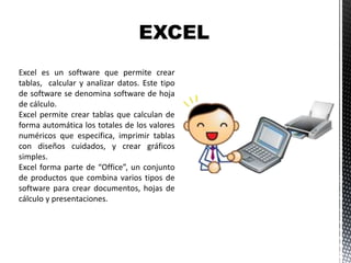 El documento describe Excel como un software de hoja de cálculo diseñado para crear tablas y analizar datos, formando parte del conjunto de productos 'Office'. Se explican funciones básicas como cambiar el formato de celdas, insertar imágenes y realizar cálculos utilizando funciones matemáticas y trigonométricas. Además, se presenta un ejemplo práctico sobre cómo calcular la nota final de un curso para cinco estudiantes basándose en distintos ítems de evaluación.