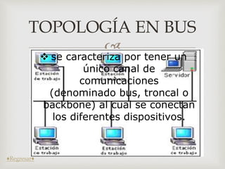 El documento describe 5 tipos de topologías de red: topología en bus, topología en anillo, topología en árbol, topología en estrella y topología en malla. La topología en bus tiene un único canal de comunicación al que se conectan los dispositivos. La topología en anillo conecta cada estación de forma secuencial. La topología en árbol conecta los nodos en forma de árbol, similar a varias topologías en estrella combinadas. La topología en estrella conecta todos los dispositivos directamente a un punto central
