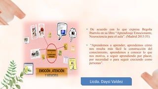El documento explora la relación entre atención, memoria y emoción desde la perspectiva de la neurociencia y la neuroeducación, destacando cómo estos elementos son cruciales para el aprendizaje significativo. Se argumenta que la neuroeducación combina conocimientos de neurociencia, psicología y educación para mejorar los métodos de enseñanza, enfatizando la importancia de la atención y la motivación en el proceso de aprendizaje. Además, se ofrecen recomendaciones para implementar un aprendizaje activo centrado en el participante, fomentando su autonomía y colaboración.