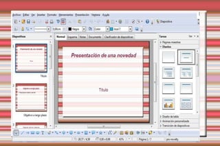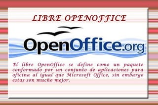 Libre OpenOffice es un paquete de aplicaciones de oficina de código abierto y acceso gratuito, diseñado para funcionar en múltiples plataformas como Linux, Mac y Windows. Incluye herramientas para procesamiento de texto, hojas de cálculo, presentaciones, diagramas y fórmulas matemáticas. La aplicación OpenOffice Impress permite crear presentaciones interactivas, ofreciendo opciones avanzadas de diseño y la capacidad de generar páginas web.