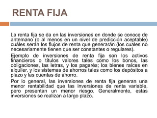 El documento describe diferentes tipos de inversiones como la renta fija, la renta variable, índices bursátiles, divisas y derivados financieros. Explica que la renta fija genera flujos de renta predecibles pero con menor riesgo y rentabilidad, mientras que la renta variable tiene flujos impredecibles pero mayor riesgo y potencial de ganancias. También define conceptos clave del mercado financiero como índices bursátiles, divisas y derivados y sus características.