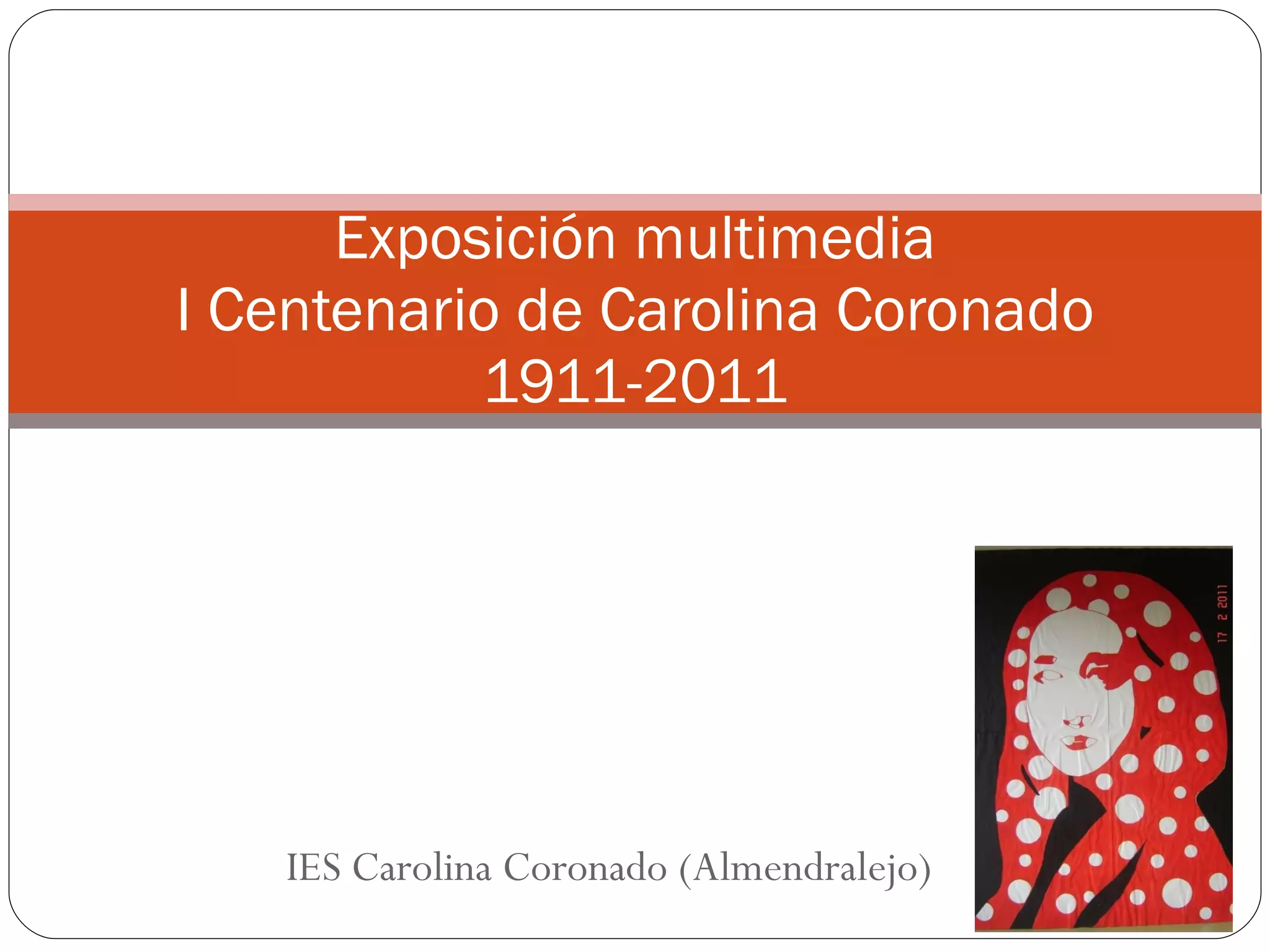 El documento presenta una exposición multimedia del centenario de la poetisa Carolina Coronado realizada en el IES que lleva su nombre. Incluye secciones sobre su biografía, los temas y personajes de su poesía, mobiliario y objetos del siglo XIX, una carta manuscrita, un taller de grabaciones y visitantes a la exposición de colegios e instituciones de la zona.