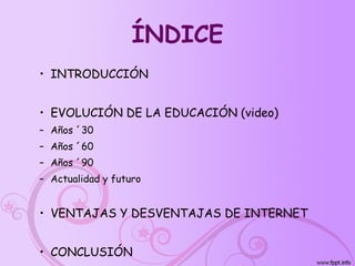 El documento describe la evolución de la educación desde los años 1930 hasta la actualidad, enfocándose en el impacto de Internet. Explica que la educación ha cambiado de ser magistral a enfocarse más en los estudiantes, y que las familias ahora se involucran más. También discute las ventajas de Internet como facilitar la comunicación y búsqueda de información, aunque existen riesgos como el acceso a contenido no apropiado. Concluye que las ventajas de la tecnología en educación superan a las desventajas.