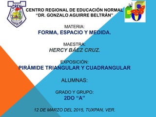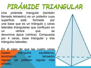 La exposición describe las características de las pirámides triangulares y cuadrangulares. Una pirámide triangular tiene una base triangular y tres caras laterales triangulares que convergen en un vértice. Una pirámide cuadrangular tiene una base cuadrangular y cuatro caras laterales triangulares que convergen en un vértice. Se describen los elementos de cada tipo de pirámide como la base, caras, aristas, altura y vértice. También se distinguen entre pirámides regulares e irregulares.