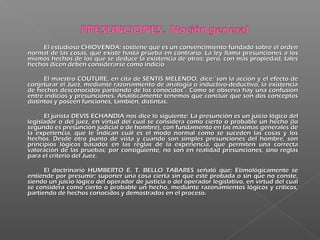 El documento discute las diferencias entre indicios y presunciones, según varios autores. Explica que las presunciones pueden ser judiciales, legales o de derecho, dependiendo de si son establecidas por el juez o legislador, y si permiten refutación de prueba o no. También cubre cómo las presunciones sirven para establecer hechos desconocidos sobre la base de hechos conocidos, y cómo influyen en la carga de la prueba en los juicios.