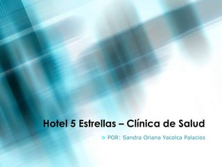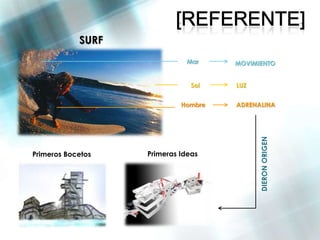 El documento presenta los primeros bocetos y ideas para crear una clínica de salud y hotel 5 estrellas. Se propone una arquitectura ecológica, dinámica y funcional tomando como inspiración el movimiento y aprovechando soluciones sustentables debido al clima. Los planos muestran la distribución de las áreas clínicas, hoteleras y zonas comunes en tres niveles, maximizando el uso de terrazas.