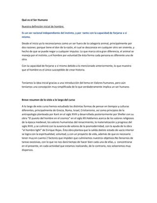 El documento resume las diferentes formas en que se ha concebido al ser humano a lo largo de la historia y de diferentes culturas. Inicialmente, se le veía como un ser racional capaz de forjarse a sí mismo, diferente de los animales guiados por el instinto. A lo largo del curso, se estudió esta concepción en distintas épocas así como principios de antropología. Aunque es complejo definir al ser humano, se le distingue por su voluntad, capacidad de cambiar las cosas, ser social y prudente, y ser capaz de apre