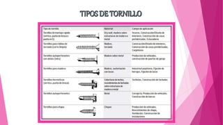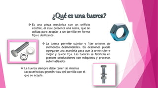 Una tuerca es una pieza mecánica con un orificio central roscado que se usa para sujetar elementos desmontables mediante un tornillo. La tuerca permite fijar uniones y a veces se usa una arandela; siempre debe tener las mismas características geométricas que el tornillo con el que se acopla. Un tornillo es un dispositivo con un cuerpo alargado y roscado que se introduce en una superficie para fijar objetos manejando su movimiento circular o rectilíneo.