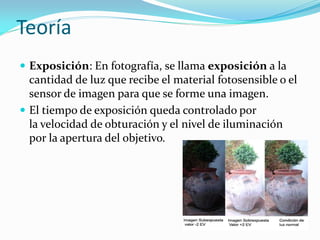 Este documento explica los conceptos básicos de la exposición fotográfica, incluyendo el tiempo de exposición, la apertura, la sensibilidad ISO y el enfoque. También describe los métodos de medición de la luz, como la medición puntual, matricial y ponderada al centro. Explica los pasos para revelar una película y ampliar una imagen, incluyendo el análisis de los negativos y copias resultantes.