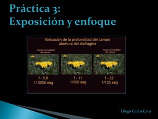 El documento describe los conceptos básicos de la exposición fotográfica, incluyendo la apertura del diafragma, la velocidad de obturación y la sensibilidad ISO. Explica cómo estos elementos controlan la cantidad de luz que llega al material fotosensible y cómo deben compensarse entre sí para lograr la exposición correcta. También cubre temas como el enfoque, manual y automático, y los diferentes tipos de medición de exposición de las cámaras digitales.