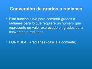 Este documento explica cómo convertir entre grados y radianes, las dos unidades para medir ángulos. Proporciona las fórmulas para convertir de grados a radianes usando la función "radianes" y de radianes a grados usando "grados". Define un radian como el ángulo que corresponde a un arco igual al radio de la circunferencia, por lo que una vuelta completa son 2*Pi radianes y Pi radianes son 180 grados.