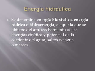 La energía hidráulica se obtiene del aprovechamiento de la energía cinética y potencial del agua mediante el uso de turbinas hidráulicas que convierten la energía del agua en energía eléctrica. Se trata de una energía renovable, limpia, de alto rendimiento y disponible de manera inagotable debido al ciclo del agua. Sin embargo, también tiene desventajas como altos costos de capital inicial y fluctuaciones estacionales en la disponibilidad de energía.