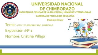 El documento presenta una exposición sobre aspectos generales del currículo. La expositora Cristina Pillajo utilizó diapositivas y un documento de Word para compartir varios puntos sobre el tema con sus compañeros. Aprendió sobre artículos relacionados con la educación y el diseño curricular en la Constitución del Ecuador y la Ley Orgánica de Educación Superior.