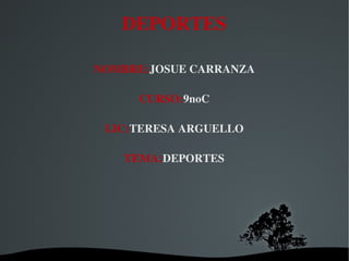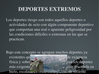 El documento habla sobre los deportes extremos y de riesgo, incluyendo instrucciones para el bungee jumping. También define conceptos como deporte, historia del deporte, profesionalismo, deporte y arte, tecnología y deporte y sociedad. Cubre temas como los orígenes del deporte en culturas antiguas, la influencia del deporte en la sociedad a través de la educación y la transmisión de valores, y el papel de la tecnología en mejorar la salud y rendimiento de los atletas.
