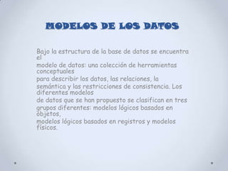 El documento describe diferentes modelos de datos, incluyendo el modelo entidad-relación, el modelo relacional y el modelo orientado a objetos. También discute los lenguajes de definición y manipulación de datos, así como los roles de usuarios y administradores en la gestión de una base de datos.