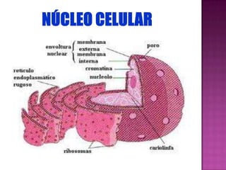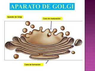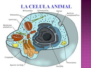 El documento describe las características principales de las células animales. Carecen de pared celular y cloroplastos, y tienen vacuolas más pequeñas que las células vegetales. Están compuestas por una membrana celular, citoplasma, núcleo con cromatina, mitocondrias, aparato de Golgi, lisosomas, centriolos y ribosomas, cada uno con funciones específicas para el metabolismo y división celular.
