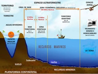 Este documento describe las diferentes zonas de jurisdicción territorial y marítima de un país según la ley nacional y el derecho internacional, incluyendo el espacio ultraterrestre, el territorio terrestre, las aguas interiores, la zona marítima territorial, la zona contigua, la zona económica exclusiva, la plataforma continental y el lecho marino. Además, especifica los artículos legales que definen cada zona.