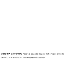 Este documento describe el análisis estructural de una pasarela colgada de un pilar de hormigón armado. Revisa conceptos históricos de eficiencia estructural y modelos de barras articuladas sometidas a compresión y tracción. Luego, modela la geometría y cargas de la pasarela y calcula las reacciones y cantidad de estructura requerida. Finalmente, considera alternativas de diseño focalizadas en la sustentación, esquema estructural y esbeltez.