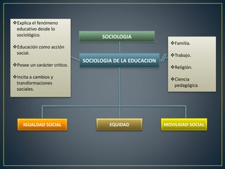 Este documento presenta conceptos clave de la sociología de la educación. Explica que la sociología de la educación estudia el fenómeno educativo desde una perspectiva sociológica, considerando a la educación como una acción social que puede incitar cambios sociales. Presenta diferentes paradigmas sociológicos como el estructural-funcionalista y marxista, y teorías como la reproducción social y la correspondencia. También aborda conceptos como poder, política educativa e intelectuales críticos.
