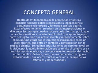 El documento describe diferentes ilusiones ópticas, incluyendo una cuadrícula centelleante cuyos puntos parecen aparecer y desaparecer, un jarrón de Rubín que muestra dos imágenes alternando, y una ilusión donde al mirar fijamente puntos y parpadear se ve a Jesús dentro de un círculo. Estas ilusiones ocurren a nivel de la percepción visual inicial y distorsionan la forma en que se perciben las figuras.