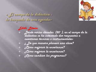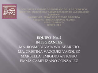El documento presenta un equipo de 4 integrantes y luego discute varios temas relacionados con la didáctica a través de las décadas. Explica que durante mucho tiempo la didáctica se enfocó en cuestiones técnicas e instrumentales en lugar de dimensiones políticas y pedagógicas. También analiza diferentes enfoques sobre la enseñanza, el aprendizaje y el currículo, resaltando la importancia de promover un pensamiento crítico y reflexivo en los estudiantes a través de un proceso de construcción cooperativa del conocimiento.