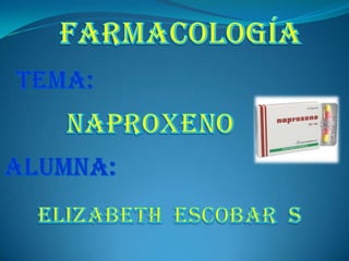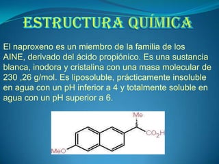 El naproxeno es un antiinflamatorio no esteroideo (AINE) derivado del ácido propiónico. Se absorbe rápidamente en el tracto gastrointestinal y alcanza su máxima concentración en la sangre entre 2-4 horas. Actúa como analgésico al bloquear la formación del impulso nervioso, como antipirético al inhibir la actividad de las prostaglandinas en el centro termorregulador hipotalámico, y como antiinflamatorio al inhibir las ciclooxigenasas y disminuir la formación de prostagland