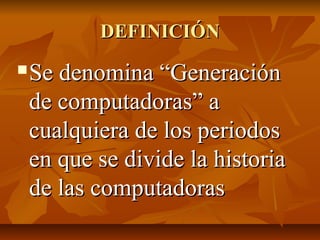 Las generaciones de computadoras se dividen por los períodos en la historia de las computadoras. La primera generación utilizaba válvulas electrónicas y se programaba en lenguaje de máquina. La segunda generación reemplazó las válvulas con transistores y se comunicaba mediante lenguajes de alto nivel. La tercera generación introdujo los circuitos integrados. La cuarta generación vio el surgimiento de las computadoras personales debido a la microminiaturización. La quinta generación se centra en la inteligencia artificial.