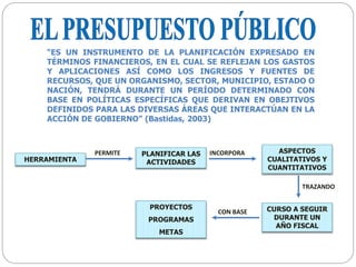 El documento describe el ciclo presupuestario como un instrumento de planificación que refleja los gastos, ingresos y recursos de un organismo público durante un período determinado. Explica las etapas del ciclo presupuestario como la formulación, programación, discusión, ejecución, control y evaluación del presupuesto. También define los ingresos y gastos del sector público.