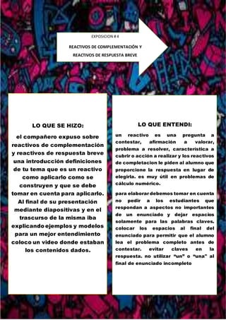 El compañero expuso sobre reactivos de complementación y reactivos de respuesta breve, proporcionando definiciones, ejemplos y un video. Los reactivos de complementación piden al alumno que proporcione la respuesta en lugar de elegirla, y son útiles para problemas numéricos. Al elaborarlos, se debe tomar en cuenta no pedir detalles no importantes y dejar espacios solo para palabras claves, colocando los espacios al final para que el alumno lea el problema completo.