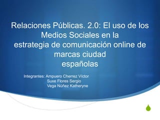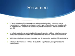 Las ciudades españolas más grandes tienden a desarrollar una estrategia de comunicación basada en la creación de una marca ciudad. El estudio encontró que la mayoría de las principales ciudades españolas tienen una marca y usan activamente las redes sociales como Facebook, Twitter y YouTube como parte de su estrategia de relaciones públicas. Sin embargo, las ciudades a menudo no aprovechan plenamente el potencial de interacción de las redes sociales.