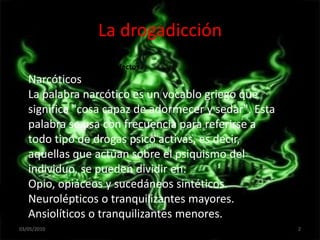 El documento habla sobre los tipos de drogas y sus efectos, incluyendo narcóticos, opiáceos, ansiolíticos y cocaína. Explica que la drogadicción es una enfermedad que produce dependencia física y psíquica de sustancias que afectan el sistema nervioso central. Además, menciona que la drogadicción no discrimina y afecta a personas de todas las razas, clases sociales y religiones.