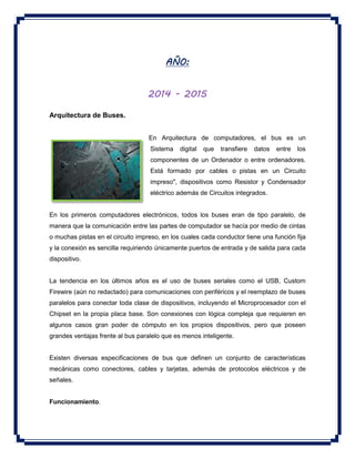 El documento describe los diferentes tipos de buses utilizados en computadoras. Explica que los buses transfieren datos entre los componentes de una computadora y pueden ser paralelos o seriales. También describe la evolución de los buses a través de tres generaciones, desde buses paralelos compartidos en los primeros computadores hasta buses seriales punto a punto en generaciones más recientes. Además, explica conceptos como dual core, front side bus y diferentes modelos de procesadores como Intel Core i3 y Core i5.