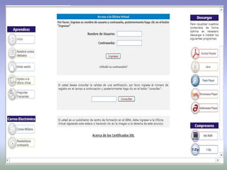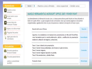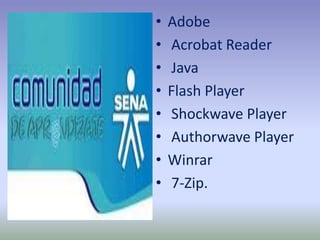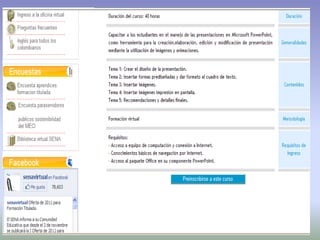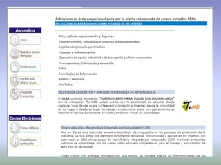 El Sena virtual ofrece a colombianos residentes en el país y en el exterior acceso a 430 cursos en línea sobre temas como Adobe Acrobat Reader, Java, Flash Player y Shockwave Player para adquirir formación educativa para el trabajo. SOFIA del SENA combina mercadeo, tecnología, diseño, cliente, materiales y producción para brindar una formación integral que resuelve problemas reales mediante proyectos y aprendizaje activo.