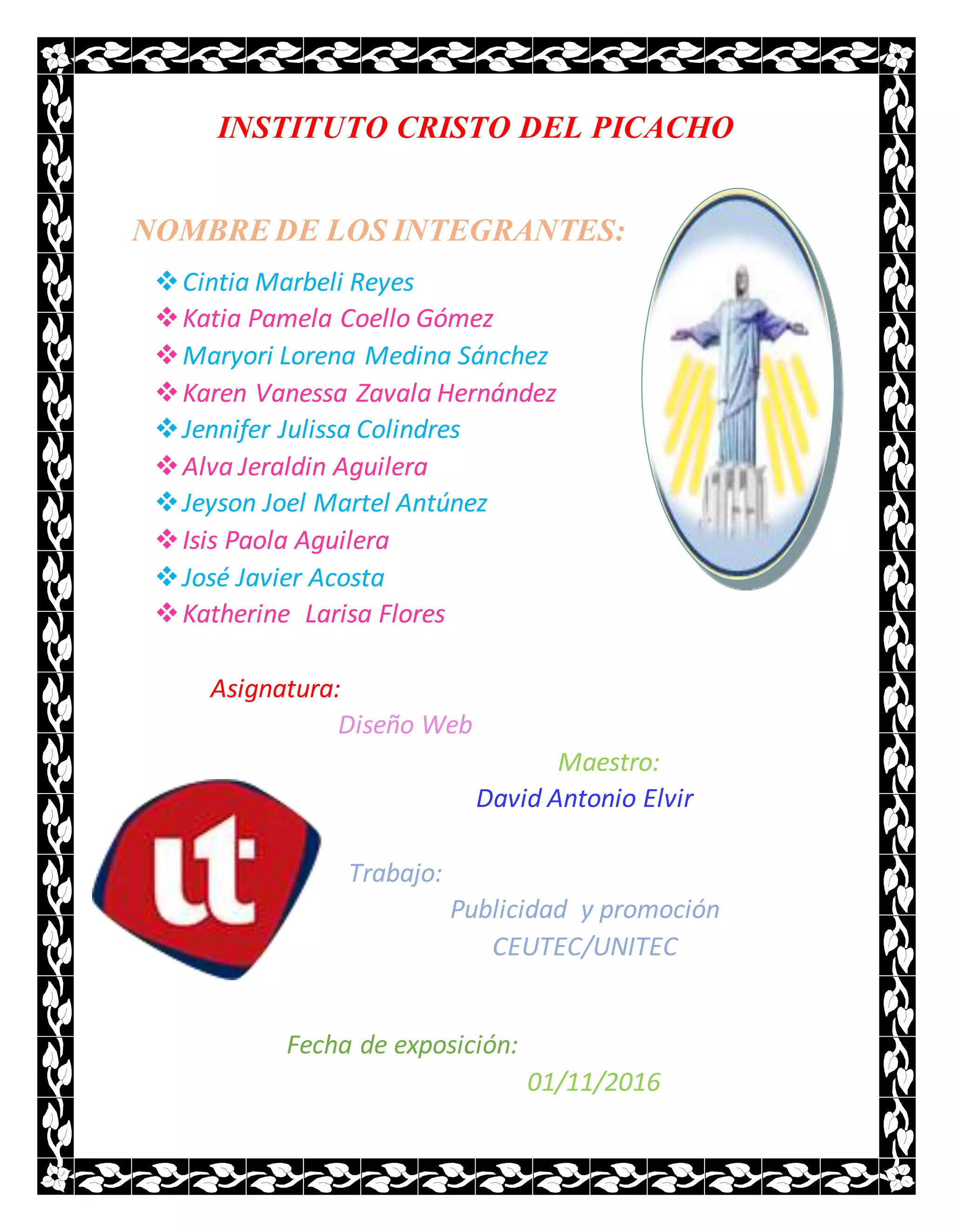 El documento presenta la información de 10 estudiantes que forman parte de un trabajo de publicidad y promoción para el Instituto Cristo del Picacho. El instituto ofrece programas de bachillerato técnico en informática y contaduría y finanzas en jornadas matutina, vespertina y nocturna. También describe brevemente el programa técnico bilingüe en call center que ofrece formación especializada en inglés y atención al cliente.