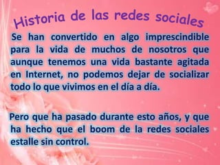 Las redes sociales han evolucionado desde 1971 cuando se envió el primer correo electrónico hasta la actualidad con sitios como Facebook y Twitter que tienen cientos de millones de usuarios. El documento describe brevemente la historia de plataformas pioneras como BBS, AOL Messenger, Friendster y MySpace y cómo las redes sociales satisfacen la necesidad humana de conexión y comunicación.