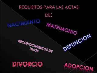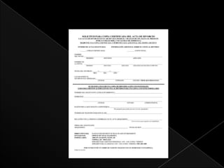 Este documento proporciona instrucciones sobre diferentes tipos de registros civiles, incluyendo el registro de nacimientos, divorcios, reconocimientos, adopciones, defunciones y matrimonios. Detalla los datos que deben incluirse en cada acta de registro civil, como los nombres, fecha y lugar de nacimiento del individuo, así como información sobre los padres y tutores legales.