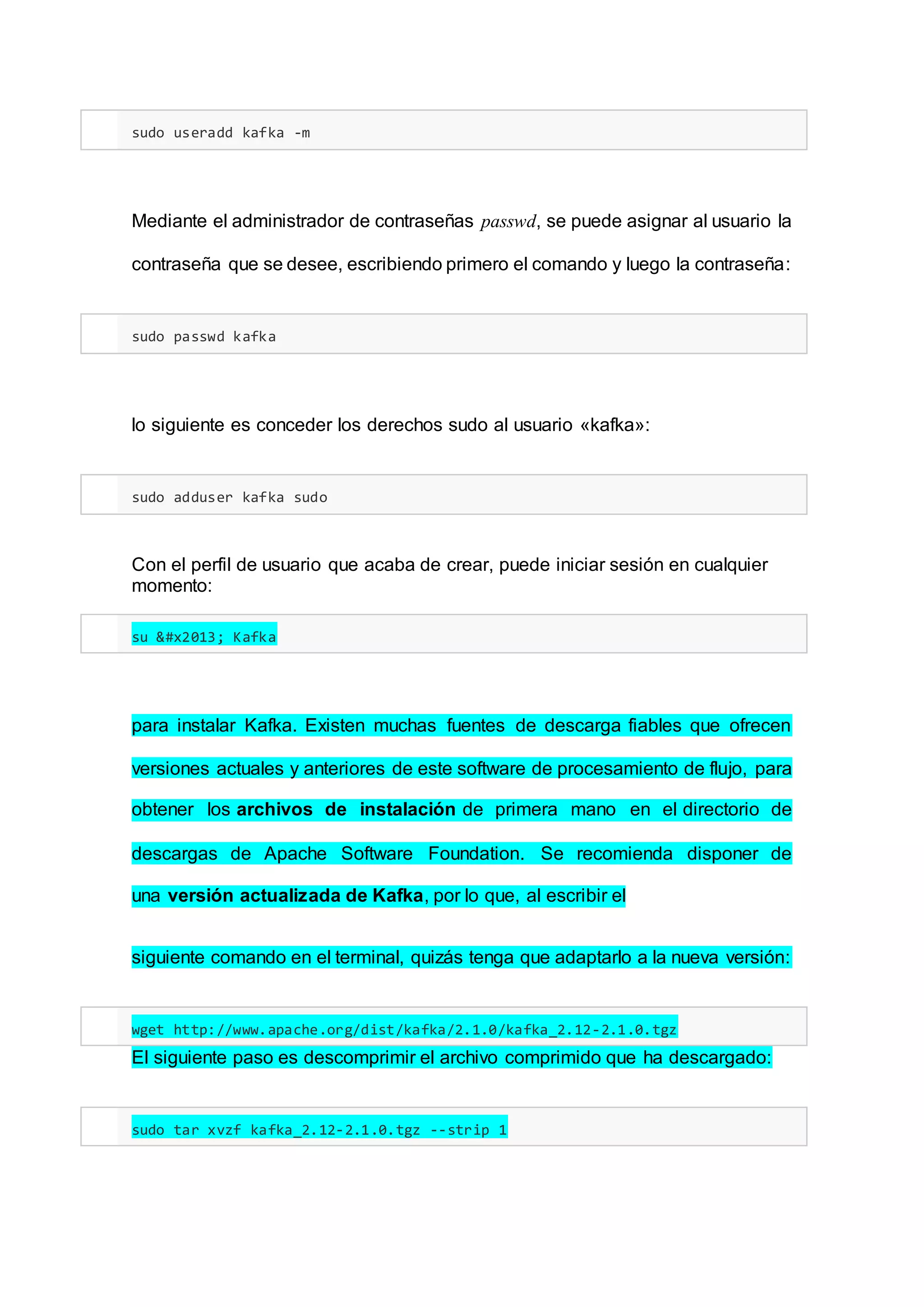 Este documento describe los pasos para instalar Apache Kafka, ZooKeeper y Java en Ubuntu, incluyendo la descarga e instalación de los paquetes necesarios, la creación de un usuario kafka, y la configuración de los servicios de ZooKeeper y Kafka para que se ejecuten automáticamente al iniciar el sistema. También explica cómo crear un primer topic en Kafka llamado "TutorialTopic" y probar la publicación y consumo de mensajes a través de scripts de línea de comandos de productor y consumidor.