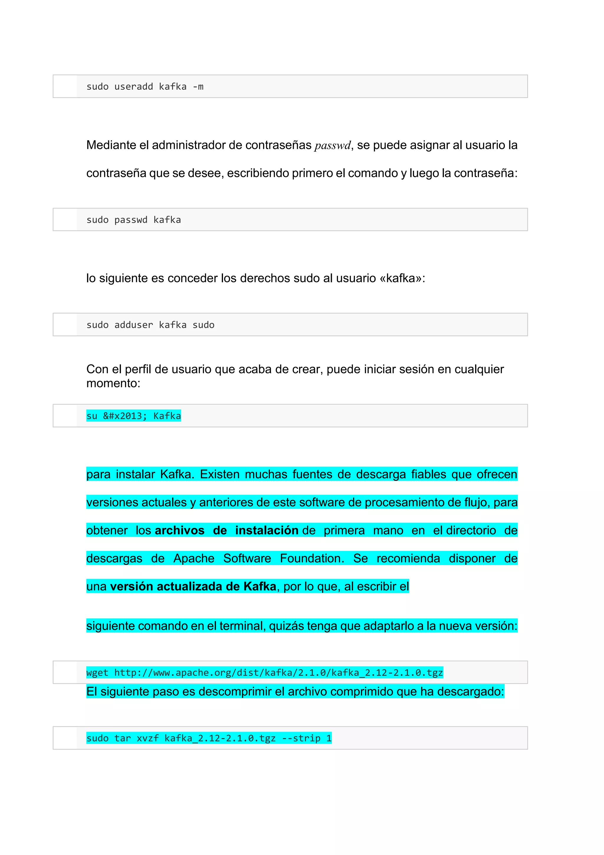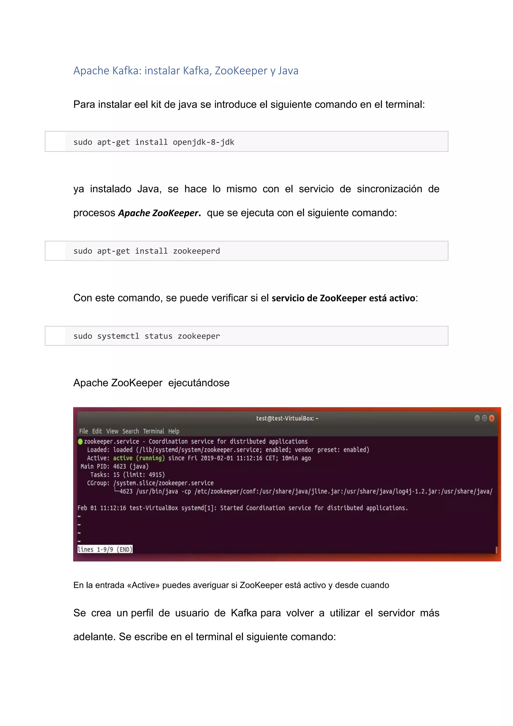 Este documento describe los pasos para instalar Apache Kafka, ZooKeeper y Java en Ubuntu. Explica cómo crear un usuario kafka, descargar e instalar Kafka y configurar ZooKeeper y los servicios de Kafka para que se inicien automáticamente al arrancar el sistema. También muestra cómo crear un topic de prueba y publicar y consumir un primer mensaje en Kafka para validar la instalación.