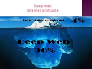 La deep web es la parte de la web a la que los motores de búsqueda no pueden acceder directamente. Contiene sitios web protegidos y páginas dinámicas que no son indexadas. Se estima que es 500 veces mayor que la web superficial a la que sí pueden acceder los motores de búsqueda. Algunas formas de acceder a la deep web son utilizando programas como Tor u Onion Router, que permiten la navegación de forma anónima.
