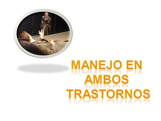 Este documento presenta información sobre el diagnóstico y tratamiento del trastorno bipolar. Describe los diferentes tipos de episodios que definen los trastornos bipolar I y II, así como las características clínicas de cada uno. Además, resume los enfoques de terapia psicosocial y las opciones farmacológicas para el tratamiento, incluyendo litio, anticonvulsivantes y antidepresivos.
