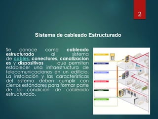 El documento describe los componentes y características de un sistema de cableado estructurado, incluyendo cables, conectores, áreas de trabajo, cableado horizontal y vertical, armarios de telecomunicaciones, cuartos de equipos y normas. Un sistema de cableado estructurado permite integrar múltiples servicios como voz, datos y video en un edificio de manera flexible, escalable y que cumpla con estándares.