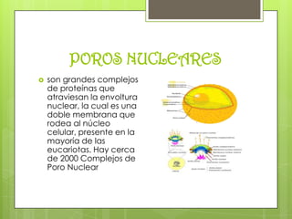 Este documento resume las principales partes de una célula eucariota vegetal. Incluye poros nucleares que atraviesan la envoltura nuclear, heterocromatina localizada en la periferia del núcleo, ribosomas que sintetizan proteínas, una membrana externa permeable y una membrana interna altamente selectiva con complejos enzimáticos.
