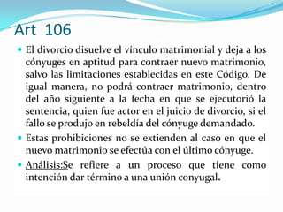 Este documento resume varios artículos del Código de Familia relacionados con el divorcio. Explica que el divorcio disuelve el vínculo matrimonial y deja a los cónyuges en aptitud para contraer nuevo matrimonio. También describe los diferentes tipos de divorcio como el divorcio por mutuo consentimiento, el divorcio judicial y las causales que pueden dar lugar a un divorcio. Además, señala que en los procesos de divorcio se debe resolver la situación económica y de cuidado de los hijos menores de edad.