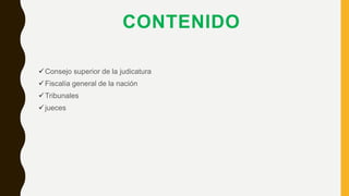 El documento describe las principales instituciones de la rama judicial en Colombia. Incluye el Consejo Superior de la Judicatura, que administra los recursos de la rama judicial; la Fiscalía General de la Nación, que investiga delitos y acusa a los infractores; los tribunales, que resuelven litigios; y los jueces, que toman decisiones basadas en las pruebas presentadas. También explica la clasificación y funciones de estos organismos dentro del sistema judicial colombiano.