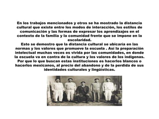 El documento describe cómo la escuela en el siglo 20 tuvo un efecto homogeneizador que marginó a las comunidades indígenas, obligándolos a dejar de hablar sus lenguas maternas y adoptar el español. La distancia cultural entre los valores y normas de la escuela versus las comunidades indígenas llevó a muchos a abandonar el sistema escolar.