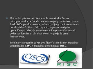 Las arquitecturas CISC y RISC representan dos filosofías diferentes para el diseño de microprocesadores. Las arquitecturas CISC tienen un amplio conjunto de instrucciones complejas, mientras que las arquitecturas RISC se enfocan en un conjunto reducido de instrucciones simples. Aunque las arquitecturas RISC ofrecen mayores ventajas de rendimiento, cada usuario debe decidir cuál arquitectura es más adecuada para sus necesidades específicas considerando factores como la aplicación, costos y rentabilidad.