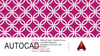 Este documento describe AutoCAD, un software de diseño asistido por computadora (CAD). Explica que AutoCAD se usa para dibujar en 2D y modelar en 3D, y que es desarrollado por Autodesk. Detalla algunas de sus características clave, ventajas y desventajas, y describe diez botones comunes y sus funciones.
